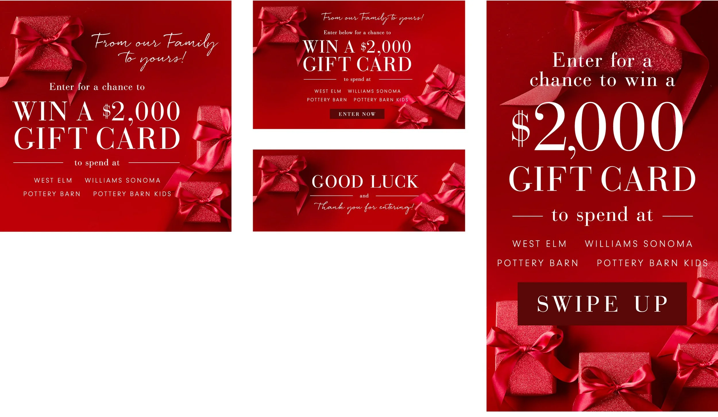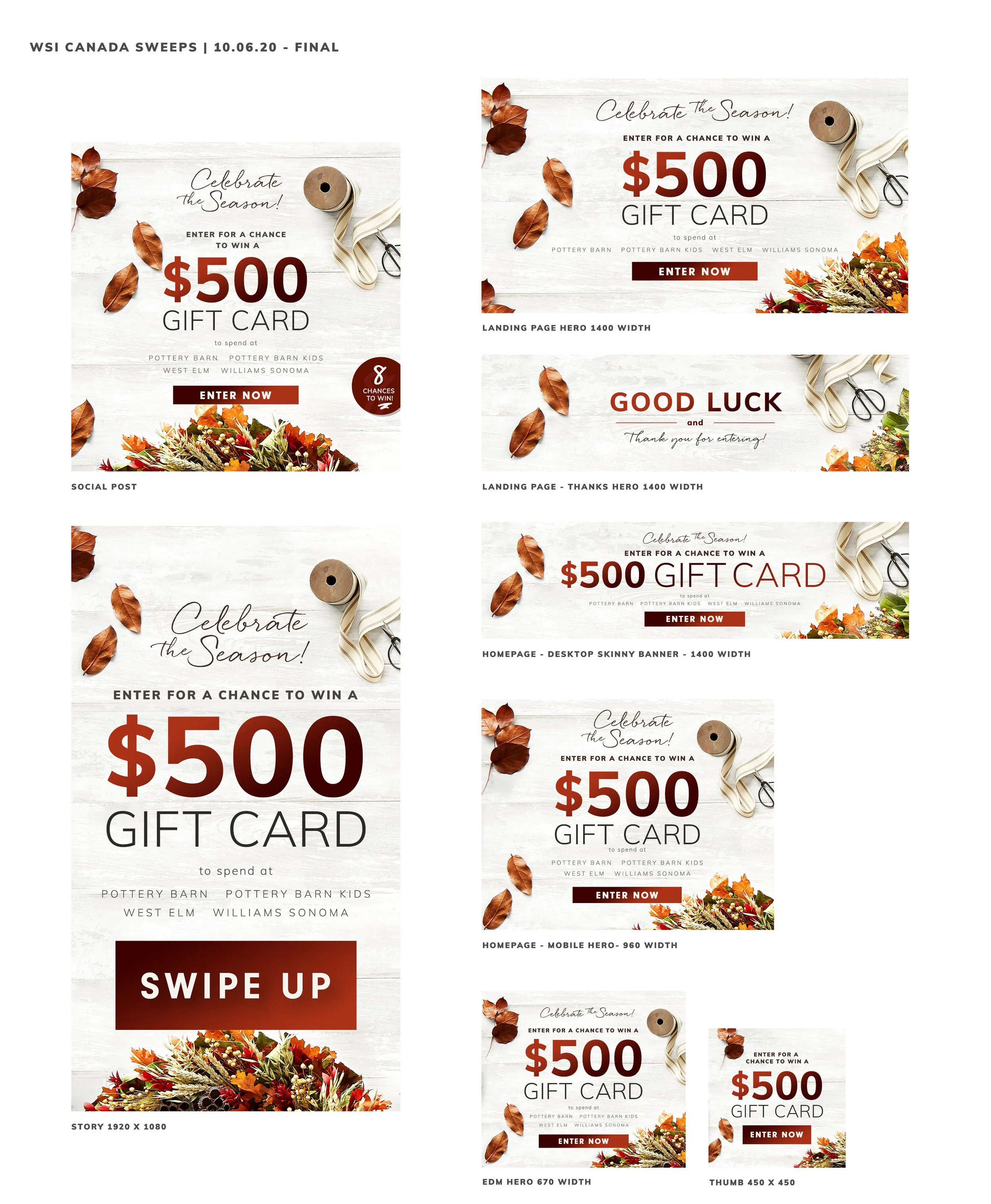 I took lead on design for Fall 2020’s cross-team Sweepstakes Creative that four brands used across Williams-Sonoma, Inc. Created original concept and revisions through approvals; generated all digital touchpoints for the campaign for desktop, mobile, eMarketing, email and social.