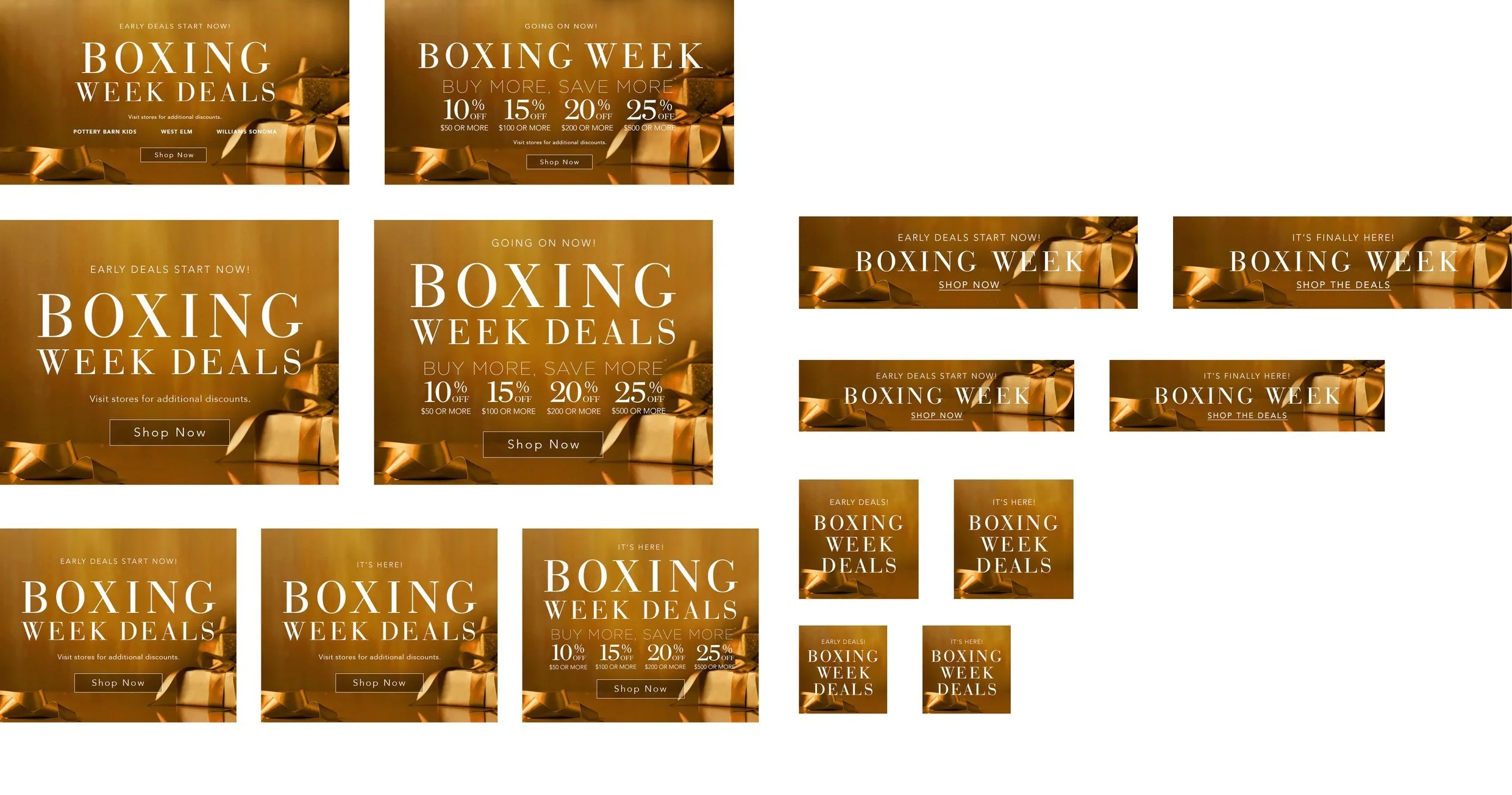 I took lead on another holiday’s campaign of design for cross-team, cross-functional Boxing Day Creative that four brands used. Created original concept and revisions through approvals; generated all digital touchpoints for the campaign for desktop, mobile and email.